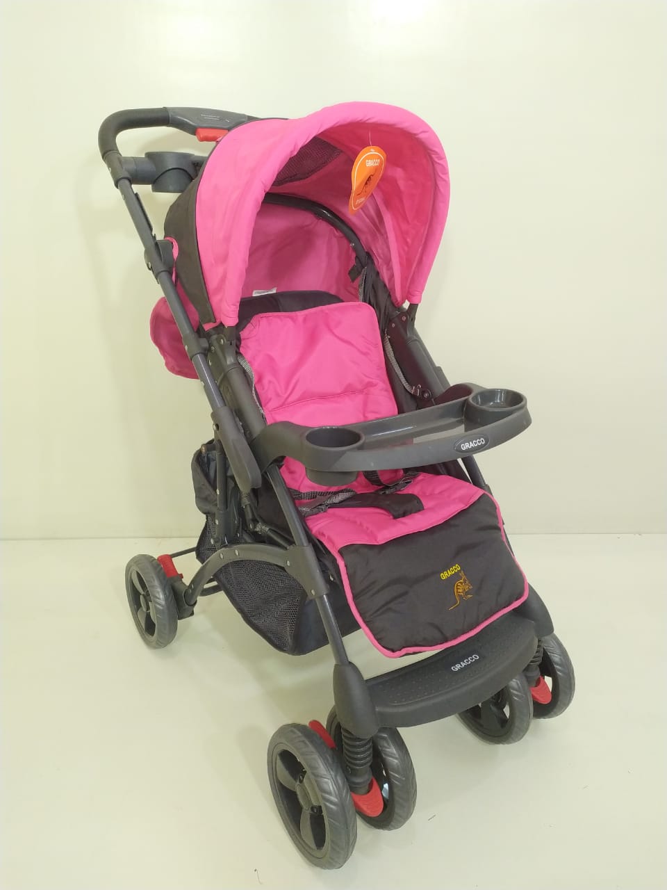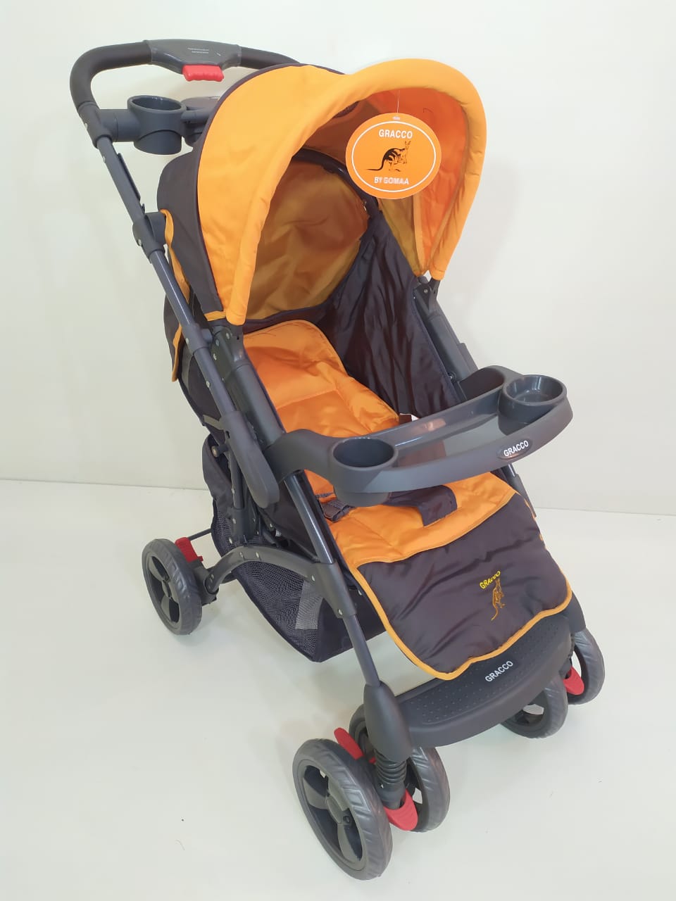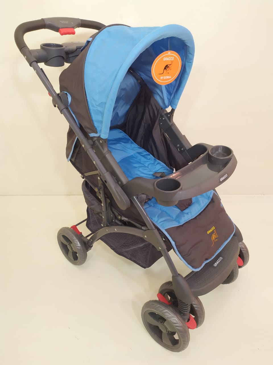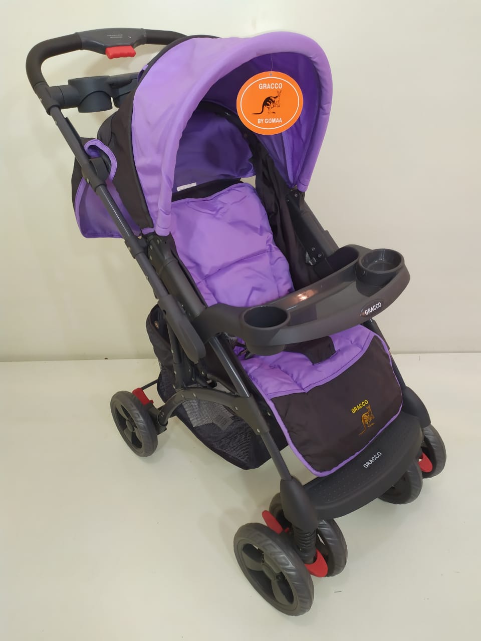 ماركة Gracco دراع قلاب فيه 3 مستويات للضهر ومستويات للرجل بار طعام للبيبي وكمان للام شاسية قوي عجل كبير فرامل خلفي ومثبت اتجاه امامي